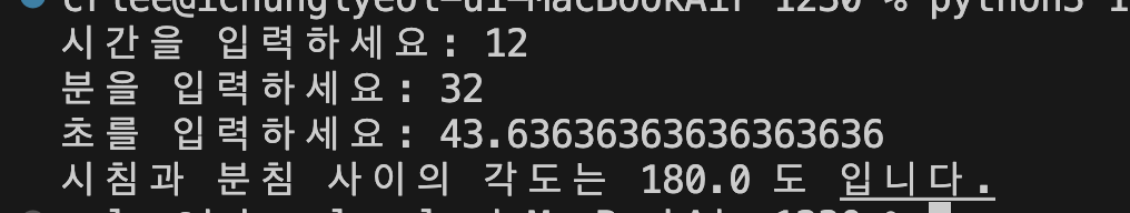 print("시침과 분침 사이의 각도는", calc_angle(hour, minute, second), "도 입니다.")