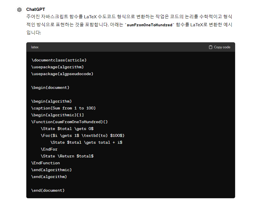 - ChatGPT를 이용한 변환: 작성한 의사코드를 ChatGPT에 보여주고 LaTeX으로 변환해 달라고 요청하세요.